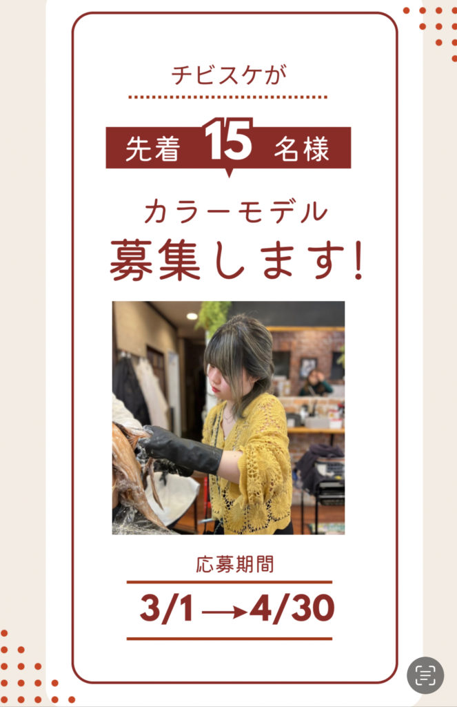 また毛量調整、毛先のカットモデルも募集しておりますので気になる方はお気軽にお問い合わせください😊(ちびすけ担当になります)
