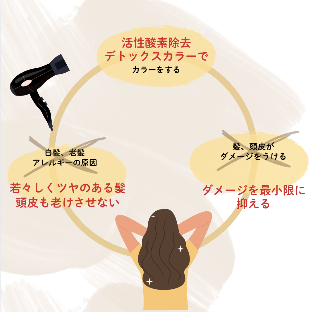 活性酸素除去デトックスカラーは、お髪の中に溜まった毒素を除去、髪や頭皮のダメージを抑えます。